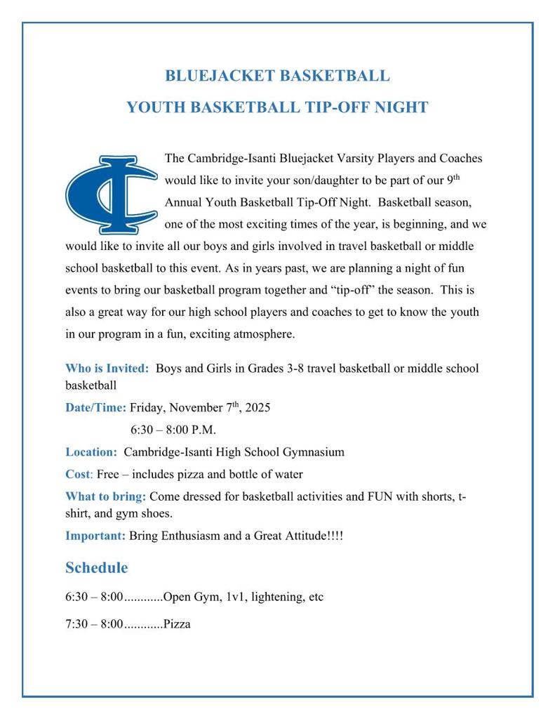 Welcome to the home of the Cambridge-Isanti Bluejackets Hoop Boosters basketball program. Our program is dedicated to helping your son and daughter to develop their skills and love for the game of basketball. We offer skills training, camps, open gyms, and a travel program throughout the year. Please follow us on Facebook!